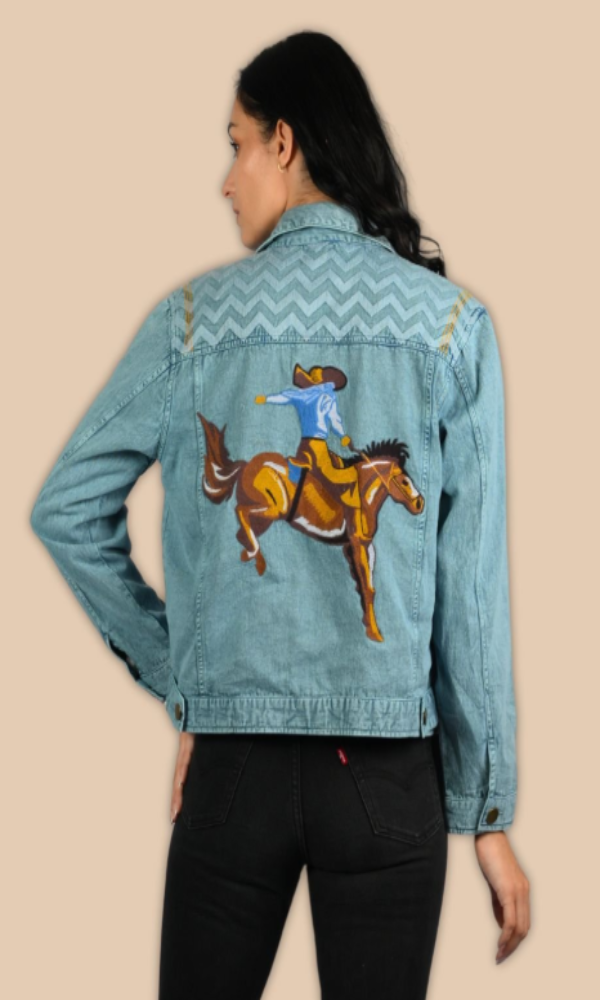 Add a bold, artistic edge to your wardrobe with this statement denim jacket. Crafted from premium-quality washed denim, this piece combines classic style with eye-catching detail. The back features a striking embroidered rodeo scene of a cowboy riding a bucking horse, bringing a touch of Western flair and individuality to your look.